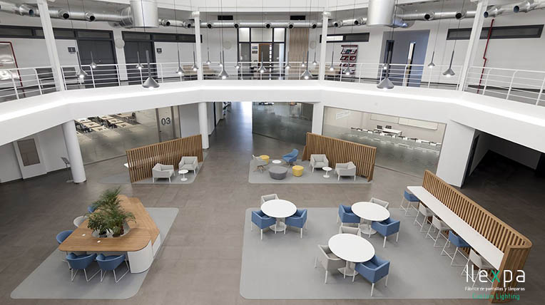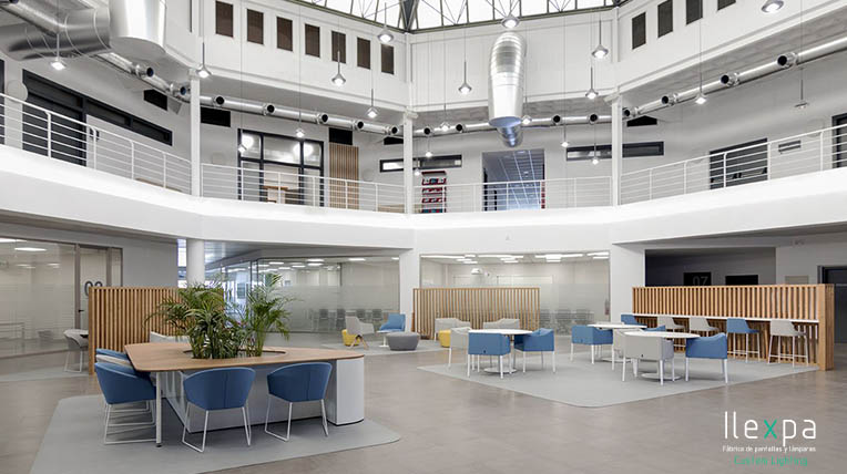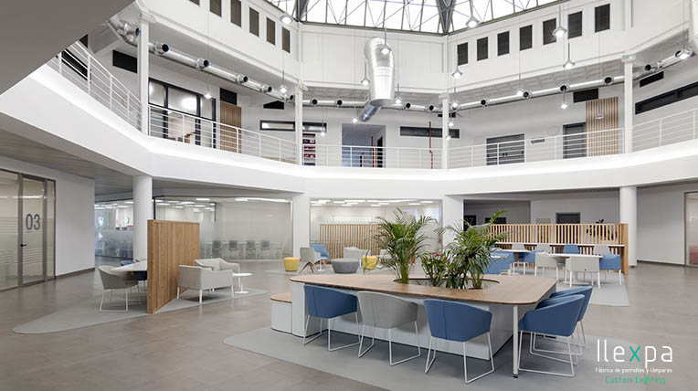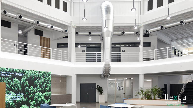 Ilexpajunto con Nihil Estudioiluminan el Hall de una Escuela de Negocios de la Cámara de Comercio en el Parque Tecnológico de Paterna (Valencia), con colgantesDurban.